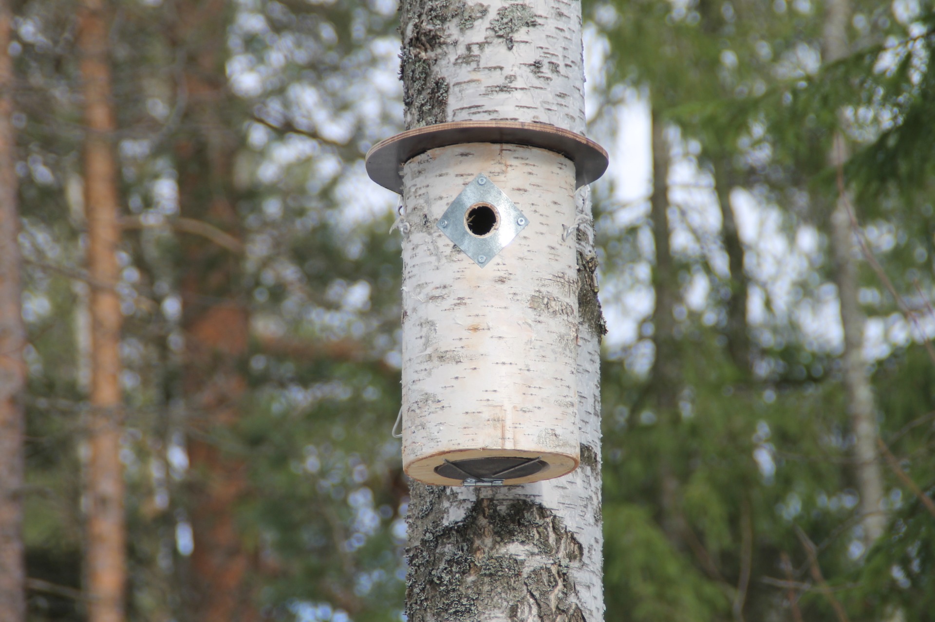Lentoaukon suoja: Pönttö on varustettu metallisella lentoaukon suojalla, jolla estetään lentoaukon suurentaminen mahdoillisten pesärosvojen(orava, tikka) toimesta. Lentoaukon suoja on suurempi kuin itse lentoaukko, että metalli ei vahingoita lintua.